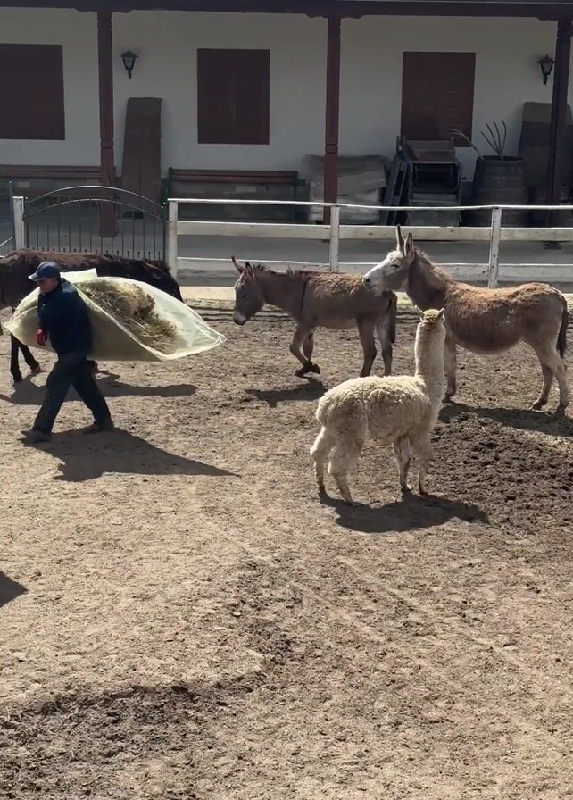 A man in a blue jacket and cap walks across a dirt yard, carrying a large load of hay. He walks past four donkeys and a white alpaca. The animals stand in a fenced-in area in front of a white building with a red tiled roof. The man approaches a feeding trough and tosses the hay into it. The donkeys move towards the trough while the alpaca remains standing in place.