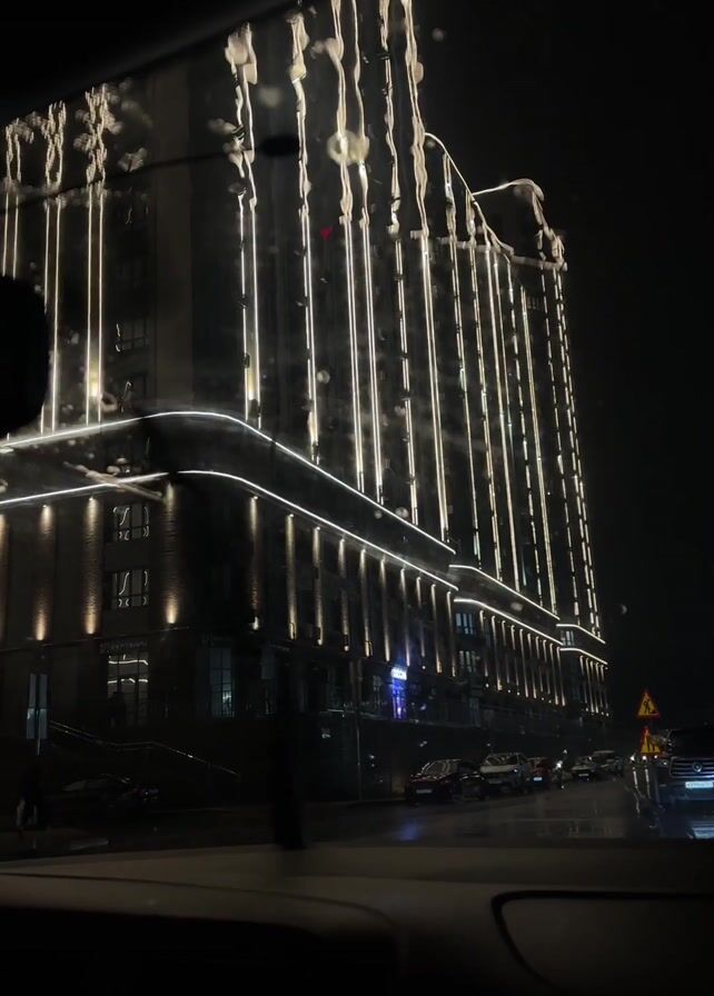 A dark urban scene captured through a wet car window reveals a large building illuminated with long vertical white lights and smaller horizontal lights