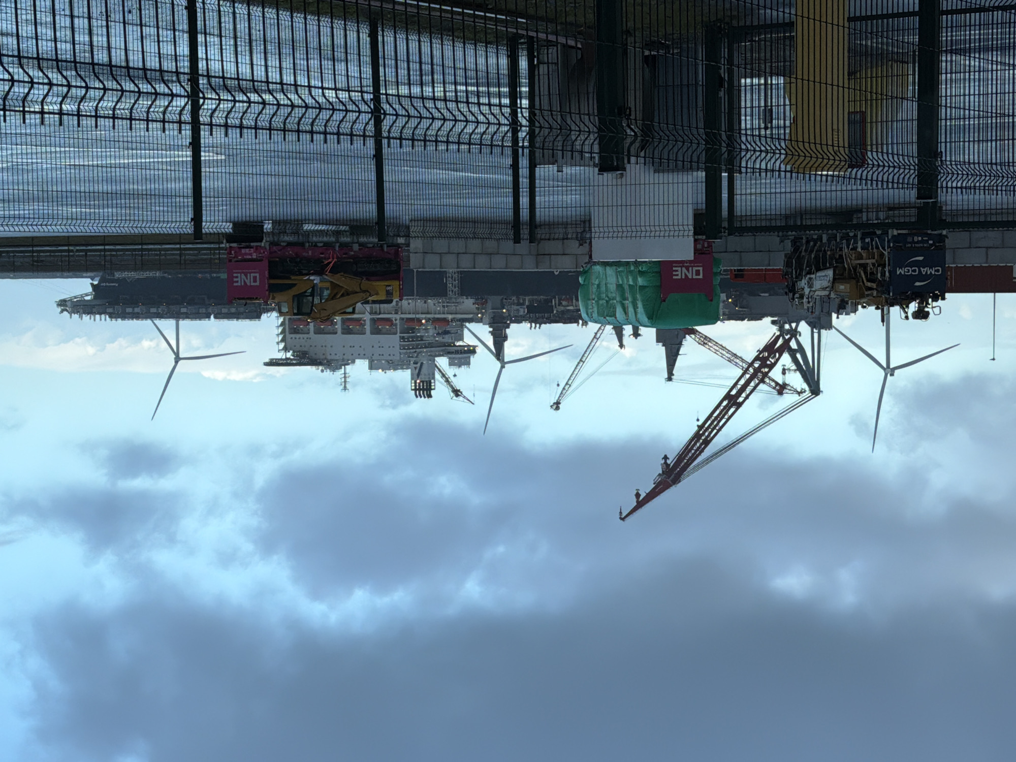 An outdoor wide shot captures an industrial port scene at Maasvlakte, Rotterdam, Netherlands, under a predominantly overcast sky with patches of lighter blue. In the immediate foreground, a dark gray metal security fence runs horizontally across the frame, partially obscuring a calm body of water beyond it. The mid-ground features a concrete or paved dock area along the water's edge. Multiple shipping containers are visible, including a green, tarp-covered container marked "ONE" and several black containers marked "CMA CGM." A large, multi-wheeled piece of heavy machinery, possibly for container handling, is positioned near the "CMA CGM" containers. Further to the right, a yellow excavator is loaded onto a pink flatbed trailer, also marked "ONE." In the background, several large vessels and structures dominate the horizon. A massive heavy-lift vessel, identified as the *Pioneering Spirit* by its distinctive design and numerous lifeboats along its broad hull, is docked. Above and around the vessels, multiple industrial cranes with red and dark gray gantries extend into the sky. Additionally, three prominent wind turbines are visible, their blades either stationary or slowly rotating. No individuals or explicit actions are discernible within the frame.