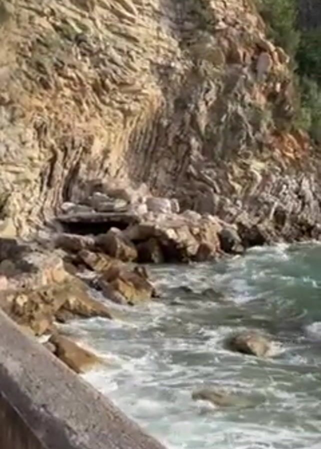 rocky coastline with waves crashing against the shore. The cliffs are made of layered rock formations, with some greenery on top. The water is a mix of green and white due to the waves. There is a stone barrier or walkway in the lower left corner of the frame. The video is taken from a slightly elevated position.