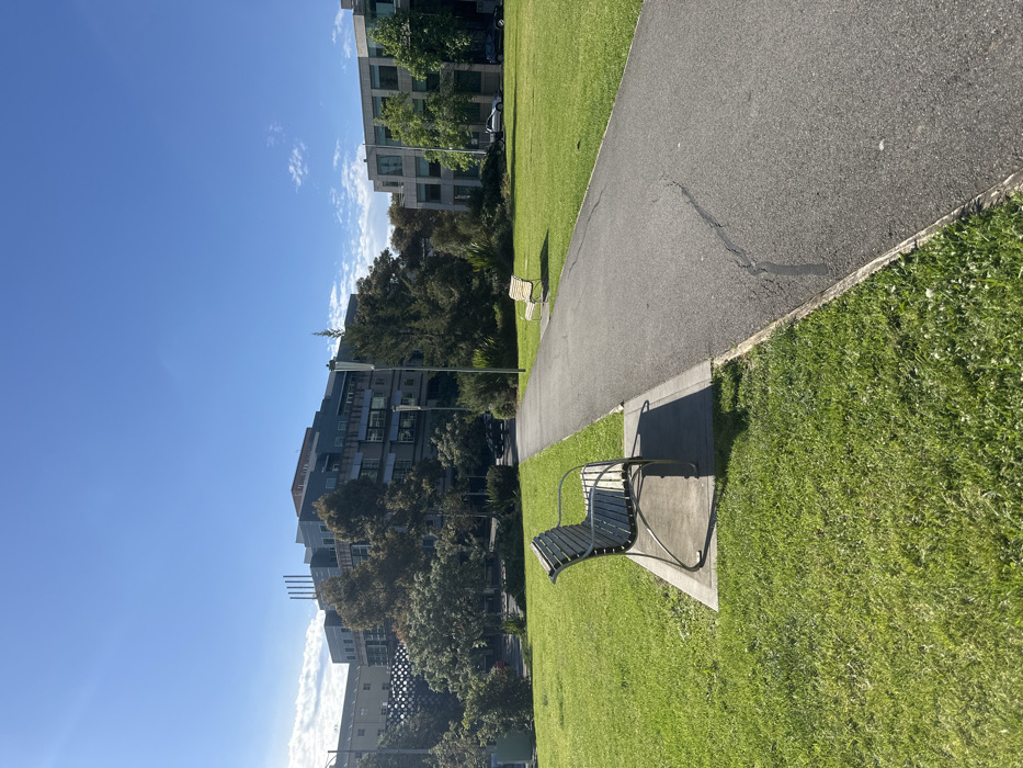 The image displays a park scene in Carlton, Australia, under a clear blue sky with minimal cloud cover. In the immediate foreground, an empty dark gray park bench with a slatted seat and backrest, and a metallic frame, is situated on a light gray concrete slab to the left of a paved asphalt pathway. The asphalt pathway extends diagonally from the lower right toward the upper left, showing a visible sealed crack in its surface. Further along the pathway in the midground, a second, lighter-colored empty park bench is positioned on its right side. Both sides of the pathway are bordered by vibrant green grass. The background features several multi-story modern buildings partially obscured by a dense arrangement of trees and shrubs. One prominent building on the left exhibits a stepped architectural design with horizontal window bands and three cylindrical structures visible on its roofline. Another building is partially visible on the far right. The scene is illuminated by direct sunlight, casting distinct shadows to the left of the foreground bench. No individuals are present.