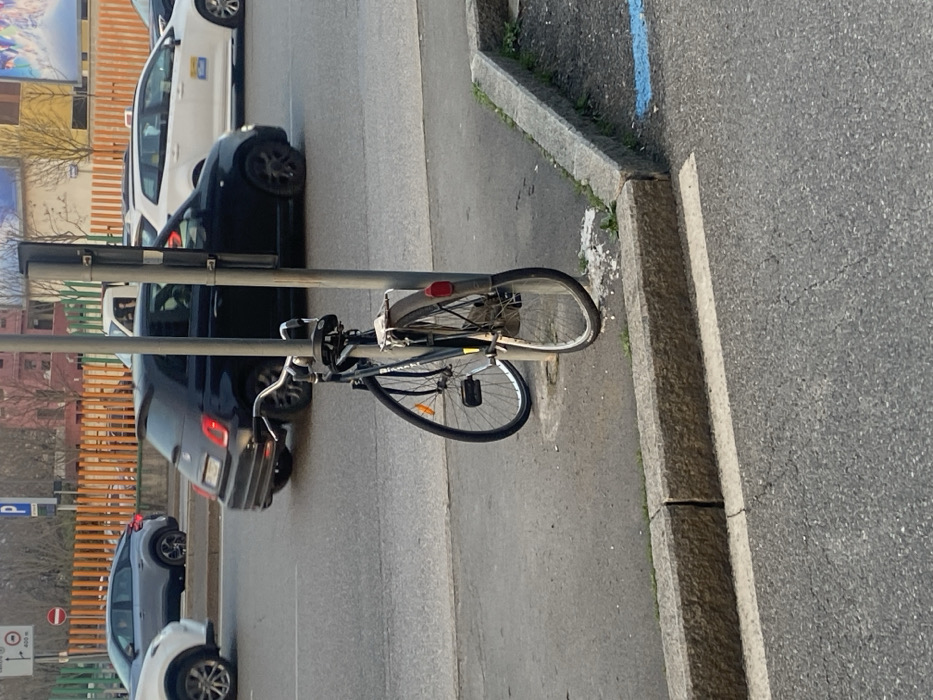 - "The scene depicts a damaged dark-colored bicycle secured to a grey metal pole on a sidewalk in Milan, Italy" by FM-KiN8j2, licensed under CC BY 4.0
