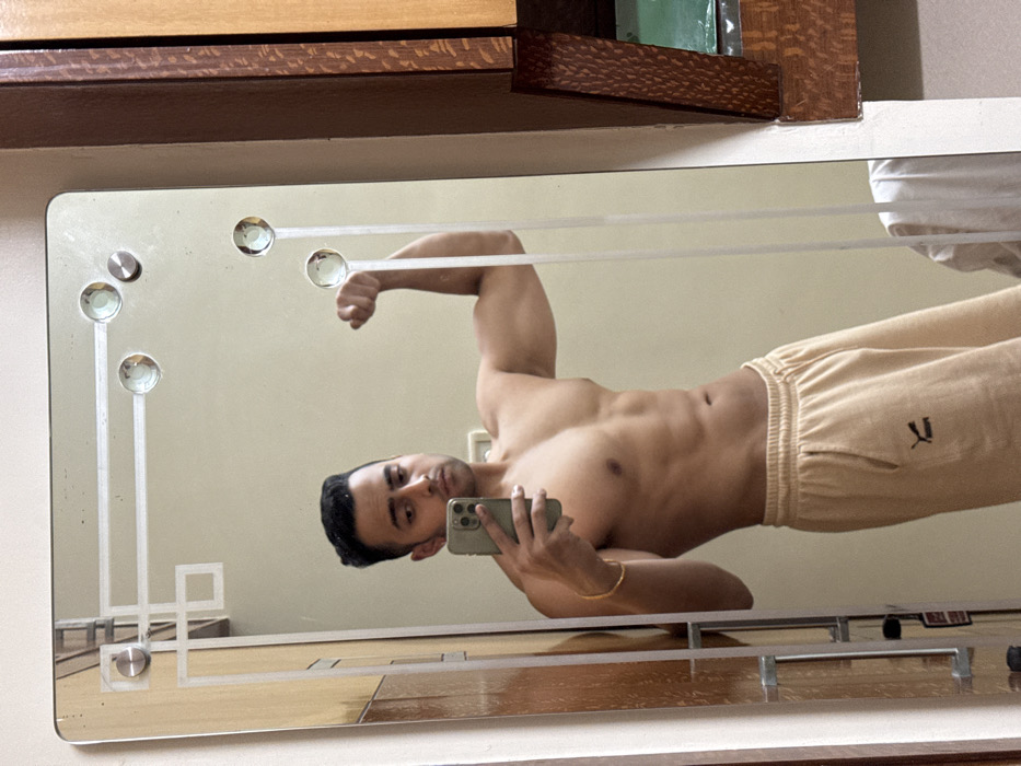 A man poses in a mirror selfie, showcasing his physique. He wears light-colored Puma sweatpants. His torso is bare, revealing visible abdominal muscles. He holds a cell phone in one hand and flexes his arm, revealing biceps. The mirror is rectangular, with decorative glass circles, attached to a brown wooden frame. The reflection shows a glimpse of a light-colored wall behind the man.