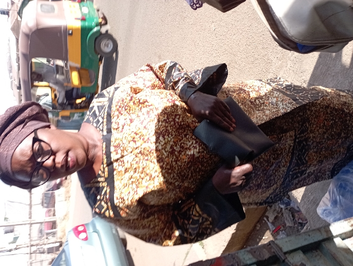 An African woman wearing a brown patterned dress and matching head wrap sits outside. She wears glasses and holds a black rectangular purse in her lap. In the background is a three-wheeled vehicle, a silver car and a metal railing. The scene is bathed in bright sunlight.