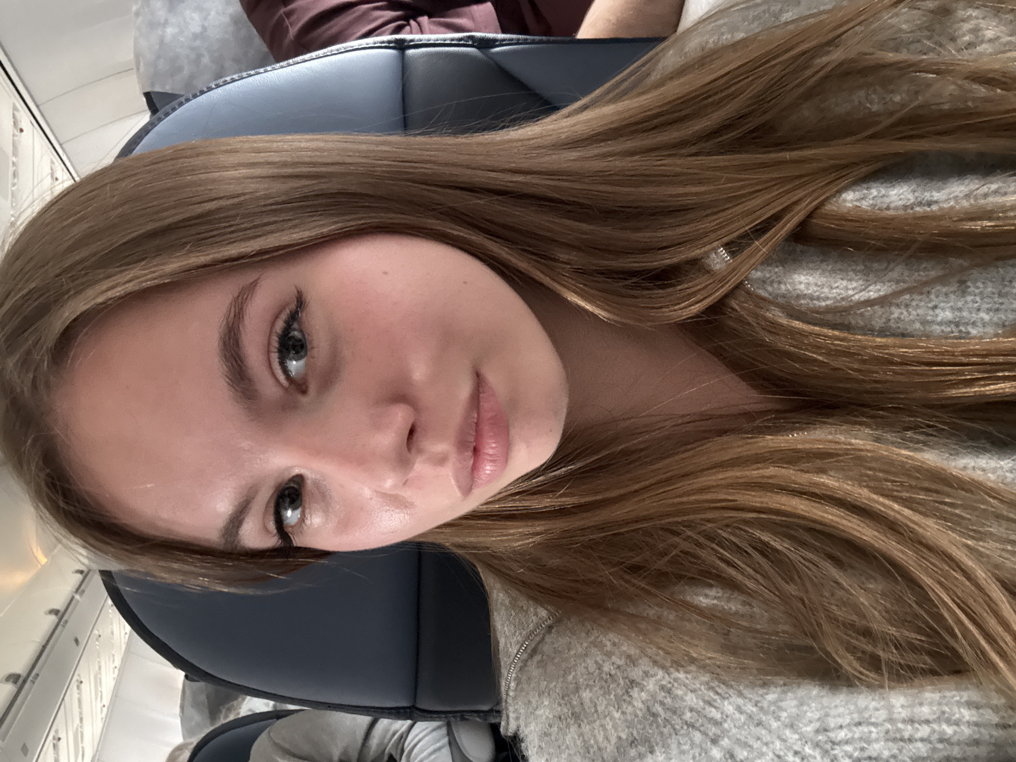 A young adult female is depicted in a medium close-up within an aircraft cabin