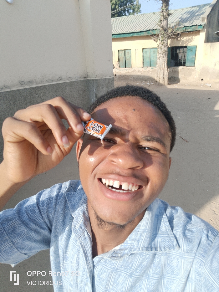 - "A young man holds a candy wrapper, a Mot Mot, near his right eye while smiling broadly" by FM-z13ma2, licensed under CC BY 4.0