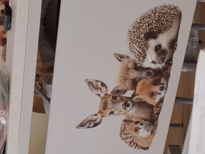 The scene depicts an indoor environment in Panagyurishte, Bulgaria, centered on a piece of light-colored furniture. The primary subject is a high-resolution print or decal of five wild animals affixed to a white, flat panel. The animals, arranged in a group and appearing to face the viewer, consist of two fawns (one large, central; one smaller, spotted, on the left), two foxes (one adult behind a smaller, younger fox, both on the right-center), and one hedgehog (on the far right). Above this panel, an open horizontal slot or drawer reveals a glimpse of light-colored fabric and other indistinct items within the furniture's interior. The top surface of the furniture, also white, is visible above the opening, displaying a clear plastic bag containing small white objects, a textured brown material, and a small black electronic device positioned towards the right. Below the animal panel, two metallic furniture legs are partially visible, supporting the structure. The bottom edge of the image shows an out-of-focus white surface, possibly paper or a document, in the foreground. No human subjects are present, and no active interactions are depicted; the scene is static.