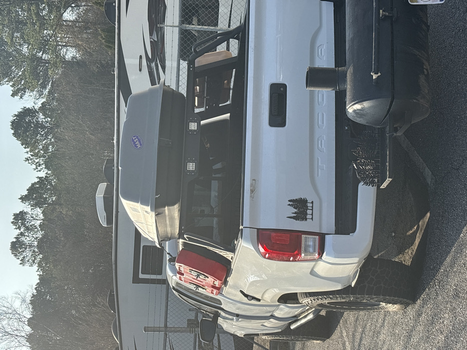 A white Toyota Tacoma pickup truck is parked on an asphalt surface in Ball Ground, United States. The vehicle is oriented with its rear and driver's side visible, under bright daylight. It is equipped with aftermarket black wheels, aggressive tires, and black side steps. A black utility bed rack system is installed, supporting a gray "MAST" brand rooftop cargo box over the cab and two vertically mounted red auxiliary fuel cans on the driver's side. Four square LED auxiliary lights are affixed to the forward crossbar of the bed rack. The tailgate features a black pine tree forest decal on the lower left. A black horizontal offset smoker/grill with a chimney stack is attached to the rear hitch receiver; a small decorative plate depicting pine trees is mounted on the hitch assembly to the right of the smoker. The license plate is partially obscured by the smoker. In the background, beyond a chain-link fence with barbed wire, several white recreational vehicles are visible, followed by a dense line of trees against a bright sky.