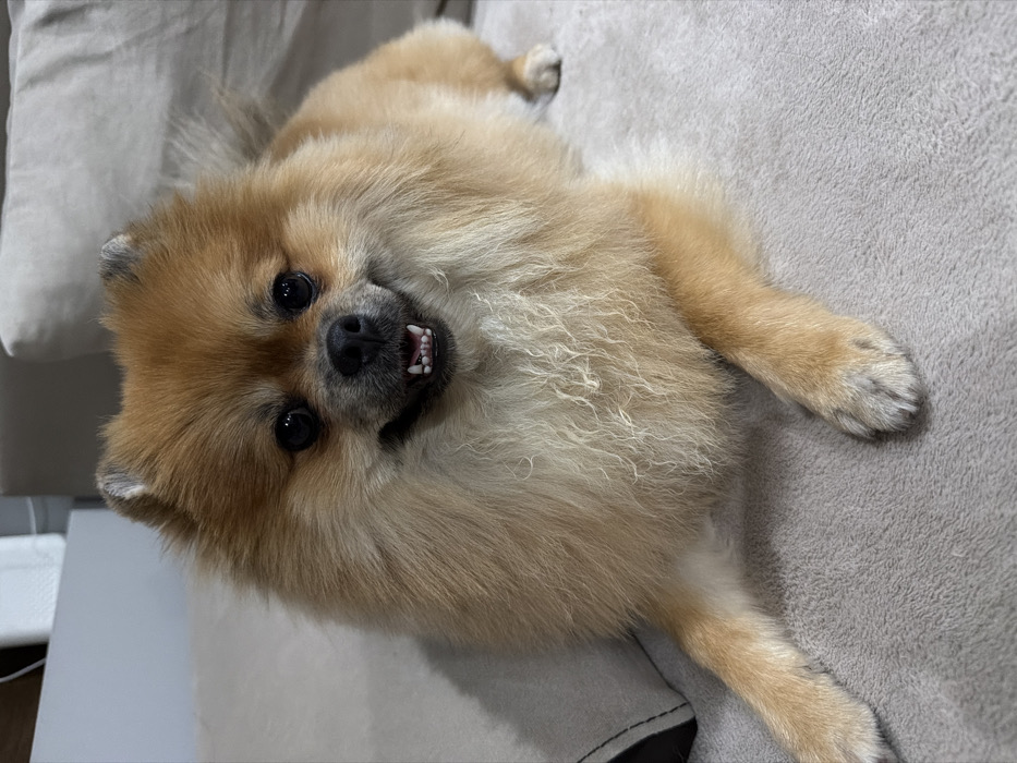 - "A small, fluffy canid of the Pomeranian breed, exhibiting predominantly tan and light brown fur, is positioned on a light grey, fabric-upholstered surface, likely a sofa or bed, within an indoor setting in Glojene, Bulgaria" by FM-hMbHr1, licensed under CC BY 4.0