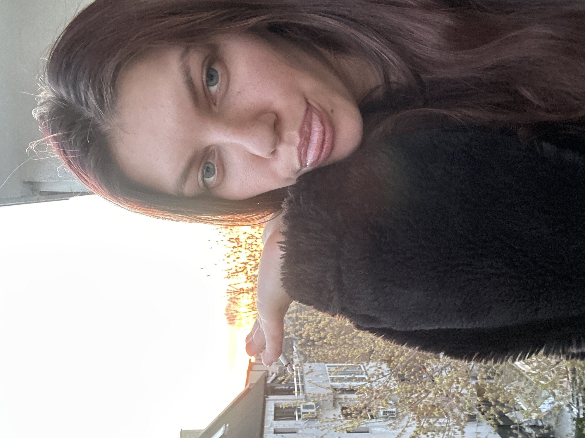 A woman with auburn hair, fair skin, and green eyes is looking at the camera, leaning on her left hand which is holding a lit cigarette. She is wearing a dark, furry garment. Outside, the buildings suggest an urban setting, likely Varna, Bulgaria, given the prompt's specifications. The light suggests it is sunset.