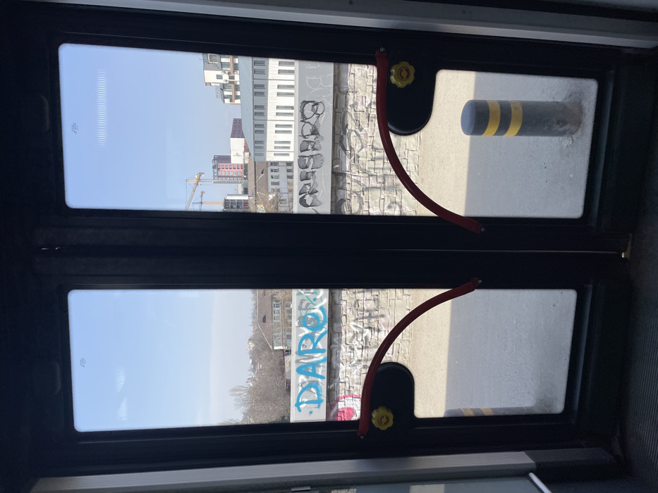 - "The image displays an exterior view through the closed double glass doors of a public transport vehicle, likely a tram or trolleybus" by FM-5fMa02, licensed under CC BY 4.0