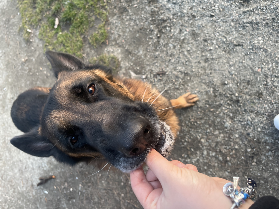The image displays an adult German Shepherd dog, predominantly black and tan, in an outdoor setting in Pancharevo, Bulgaria. The dog is oriented centrally, viewed from a high angle, with its head slightly elevated, looking towards the camera. A white, granular substance adheres to the fur around its muzzle and lower jaw. A pale-skinned human hand, adorned with a silver charm bracelet featuring multiple charms, enters the frame from the lower left, with its index finger and thumb making contact with the dog's snout, specifically near the white substance. The ground surface consists of light grey gravelly dirt, with small patches of green grass visible in the background and a few scattered twigs. The scene is illuminated by natural light, indicating daytime.