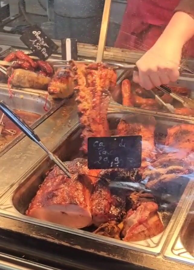A close-up shot shows a metal display case filled with various cooked meats. A person wearing a red top is seen using tongs to manipulate a piece of grilled meat that's on a skewer. Other meats are also displayed in the case, including sausages and large cuts of pork, all in separate trays. Price tags are visible on each tray. Three gas cylinders are partially visible in the background. The environment is likely a deli or butcher shop.