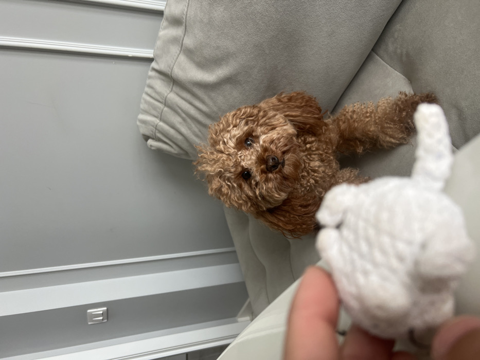 The image displays an indoor scene featuring a small, reddish-brown poodle with curly fur, seated on a light grey sofa. The dog is positioned towards the center-right of the frame, looking directly forward. In the lower-left foreground, a blurred human hand is visible, holding a white, textured object, possibly a knitted toy. The background consists of a light grey wall adorned with white vertical decorative molding. A white light switch is mounted on the wall to the left. The sofa's upholstery is a light grey fabric. No specific architectural or contextual details are present to precisely identify a location within the city of Podolsk, Russia.