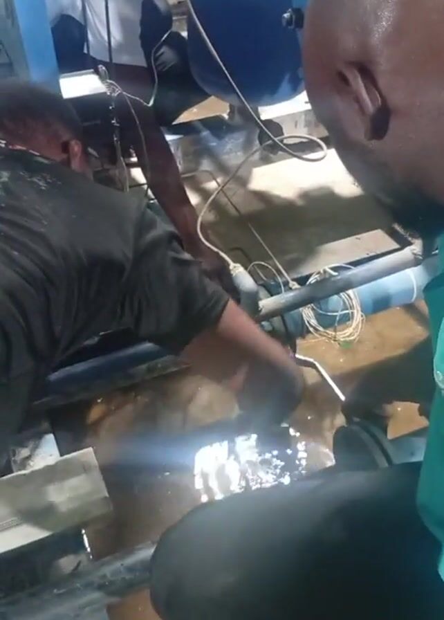 A short video shows three men working on piping and equipment in a flooded area. The focus is on one man in a black shirt who appears to be working on a section of pipe with a tool that produces bright sparks. A second man, wearing a green shirt, is standing nearby observing the work. A third man in a white shirt is partially visible in the background. The area is flooded with water, and there are pipes and other equipment visible. The environment appears to be an industrial or mechanical setting.