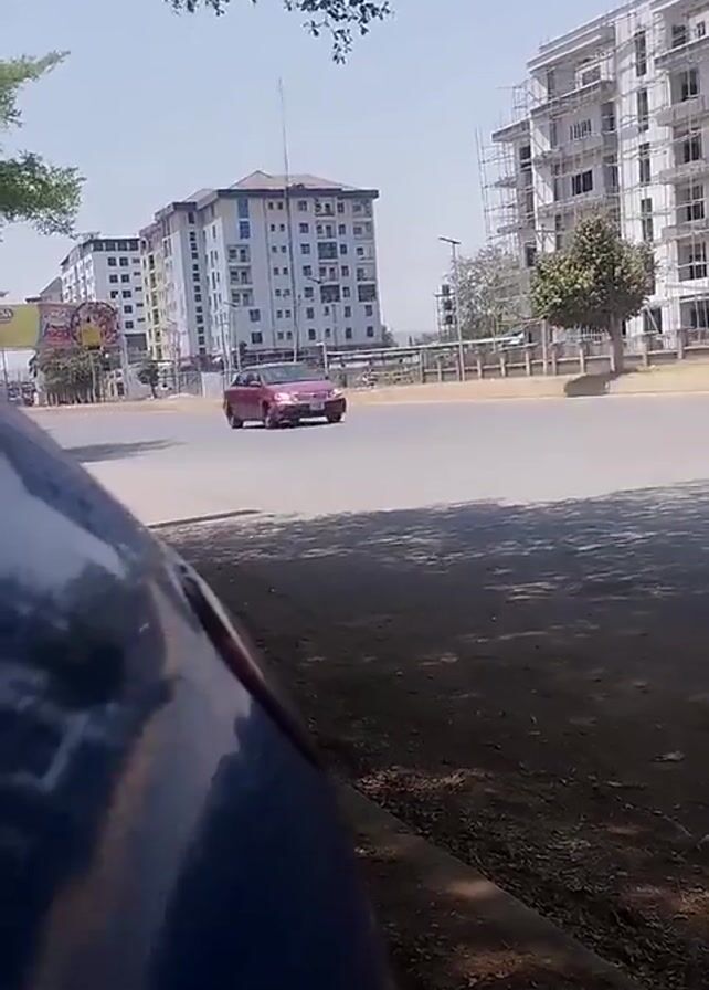 street with multiple buildings, a car, and trees. The buildings are white and grey, with multiple stories. The car is driving on the street. The trees are green and provide shade. The video is taken from behind a car.