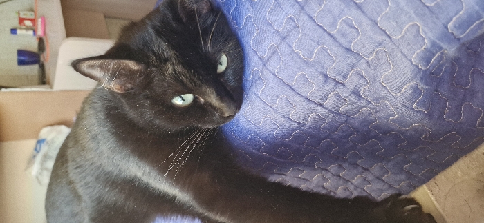 - "A sleek black cat with piercing green eyes reclines against a blue quilted fabric" by FM-tLenL2, licensed under CC BY 4.0