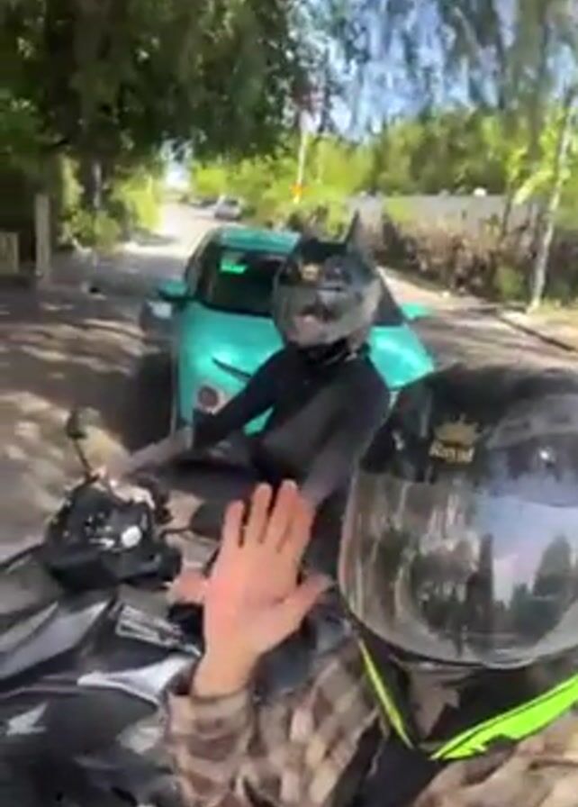 Two people wearing helmets sit on motorcycles on a sunny day in a residential area. The person filming is wearing a plaid shirt. The other person is wearing all black. Behind them is a green car. Both people on motorcycles wave at the camera.