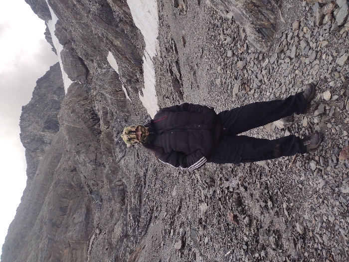A person in a black jacket and pants stands on a rocky, mountainous terrain. Patches of snow are visible on the ground and on the steep rock face in the background. The person wears a patterned head covering and dark shoes. The landscape appears rugged and barren, suggesting a high altitude or alpine environment.