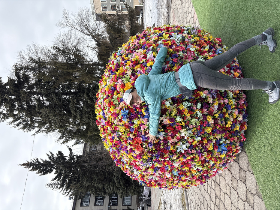 In Petropavl, Kazakhstan, a woman poses beside a large, spherical floral sculpture. The woman, dressed in a light blue hooded puffer jacket, grey athletic leggings, grey hiking shoes, and a light blue baseball cap, smiles towards the camera with her arms extended and pressed against the sculpture. A dark grey fanny pack is worn around her waist. The spherical object is approximately 2.5 meters in diameter and densely covered with artificial flowers of various colors, including red, pink, yellow, blue, purple, orange, and green. The immediate foreground features artificial green turf on the right and hexagonal grey paving stones on the left. In the background, several tall evergreen trees and a bare deciduous tree are visible, alongside multi-story buildings; one prominent structure is a grey, multi-windowed building on the left. Patches of residual snow are visible on the ground in the mid-distance, under an overcast sky.