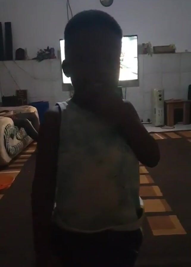 A young boy stands in a dimly lit room. He wears a sleeveless shirt and dark shorts. His face is obscured by shadows. In the background, there's a TV screen emitting a bright light, and furniture like a couch, speakers, a small table, and an air purifier are visible. The floor is covered with a patterned rug. The boy touches his mouth or chin with his hand as he looks at the camera.