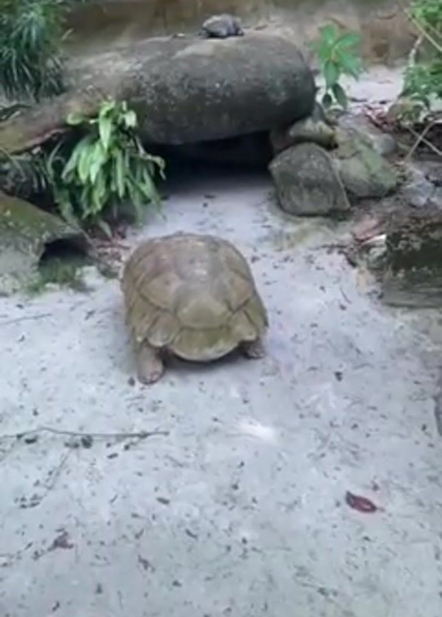 large tortoise standing on a sandy surface with its rear end facing the camera. Behind the tortoise is a rock formation with a small dark hole in it. On top of the rock, there is another tortoise, smaller in size. The area is surrounded by lush greenery, including ferns and tall trees. Sounds of people talking can be heard in the background.