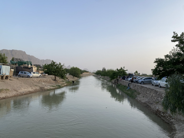 canal in Sard-E 'olya, Afghanistan, located at the coordinates 31.716 latitude, 65.705 longitude. There are a group of people gathered on the right bank of the canal. The group consists of several people standing and a few sitting on the ground. The bank is lined with a stone wall. There are a few cars parked on the right bank of the canal. In the distance, there is a line of trees and a mountain range. The sky is blue and cloudless. The canal is filled with water and appears calm. The trees are green and leafy. The overall scene is peaceful and idyllic.