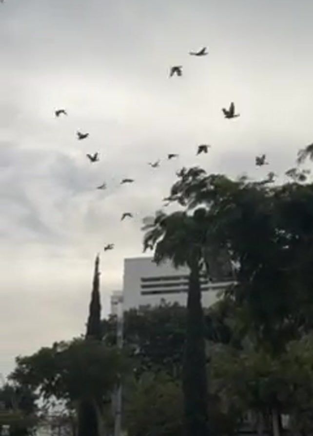 flock of birds flying in an urban setting. Initially, a small group of birds is seen against a cloudy sky, above green trees and modern buildings. As the video progresses, the flock grows larger, swarming across the sky. The camera pans, following the birds as they fly over monuments and trees. People are visible in the background, walking and interacting in the urban landscape. The focus remains on the birds and their movement against the sky.