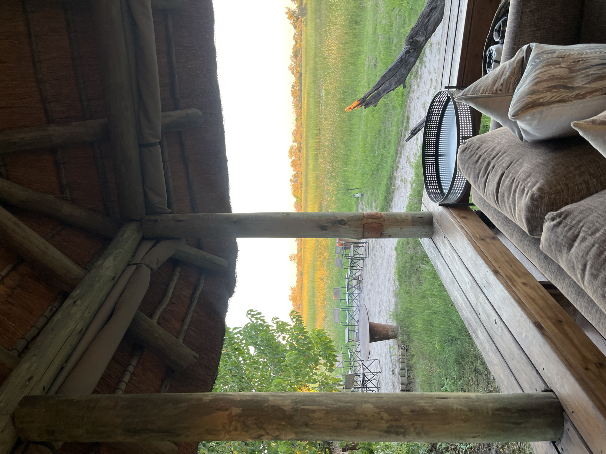 The image depicts a scene from a lodge or similar structure in Khwai, Botswana. It is viewed from an elevated, partially enclosed wooden deck with a thatched roof supported by wooden beams. Outside, a grassy plain stretches to the horizon under a yellow-tinged sky, possibly during sunrise or sunset. Seating, including a circular table and chairs, are visible in the distance. A tree is present in the foreground, partially obstructing the view. The deck includes a cushioned sofa with pillows, a round metal table, and wooden planks forming the floor and railing.
