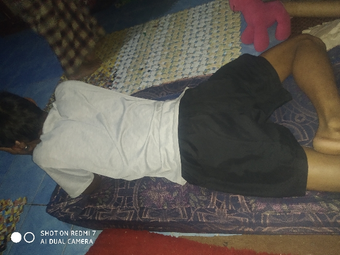 The image depicts an indoor setting in the city of Unknown, Unknown. A person is lying on their left side on a dark blue and purple patterned mat. The individual wears a light grey short-sleeved t-shirt and black shorts. Their head is turned away from the camera, partially obscured by their left arm or hand, with only the dark hair on the back of their head visible. Their legs are bent at the knees. Adjacent to the person's upper body, a bright pink, four-legged plush object rests on a light-colored patterned mat. The visible flooring beneath the mats consists of light blue tiles, with a red fabric partially visible in the bottom foreground. A brown and white checkered pattern is visible in the top left background.