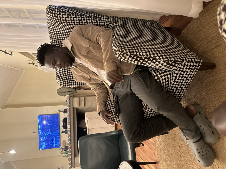 An indoor scene features an adult male seated in a high-backed armchair upholstered in a black and white houndstooth pattern