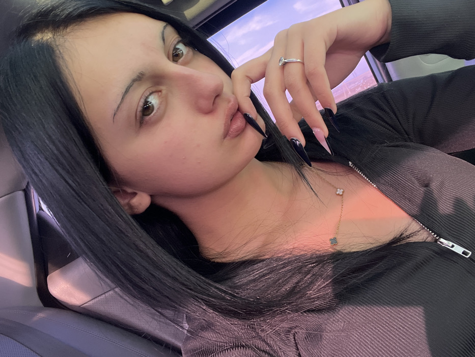 A female individual is depicted in a close-up shot, seated within the interior of a vehicle. Her dark, straight hair is visible, falling over her shoulders. She wears a dark-colored, possibly ribbed, long-sleeved top with a partially unzipped front. A gold-colored necklace with two clover-shaped charms (one dark, one light) is visible around her neck. Her right hand is raised, with fingers positioned near her mouth, displaying long, pointed artificial nails predominantly dark in color with a pink gradient near the base of some nails. A silver-colored ring with a single clear stone is worn on the ring finger of her right hand. Her lips are slightly pursed, and her eyes are directed towards the camera. The background shows a light-colored car seat with a headrest, and through a window, a light-colored sky with a faint pink hue. The specific location within the city of Surami, Georgia, cannot be determined from the visual information provided, as the scene is entirely confined to the vehicle's interior.