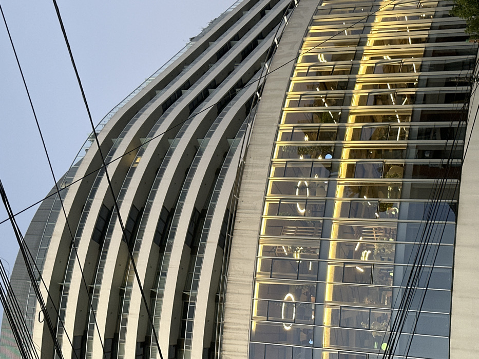 A modern architectural view showcases two sections of a tall building. The left side features a repetitive pattern of balconies with white railings creating curved lines. The right side has a glass façade, reflecting sunlight and interior details. The windows reveal plants and circular light fixtures. Power lines diagonally cross the image. The overall composition captures the building's unique design and interplay of light and shadow.