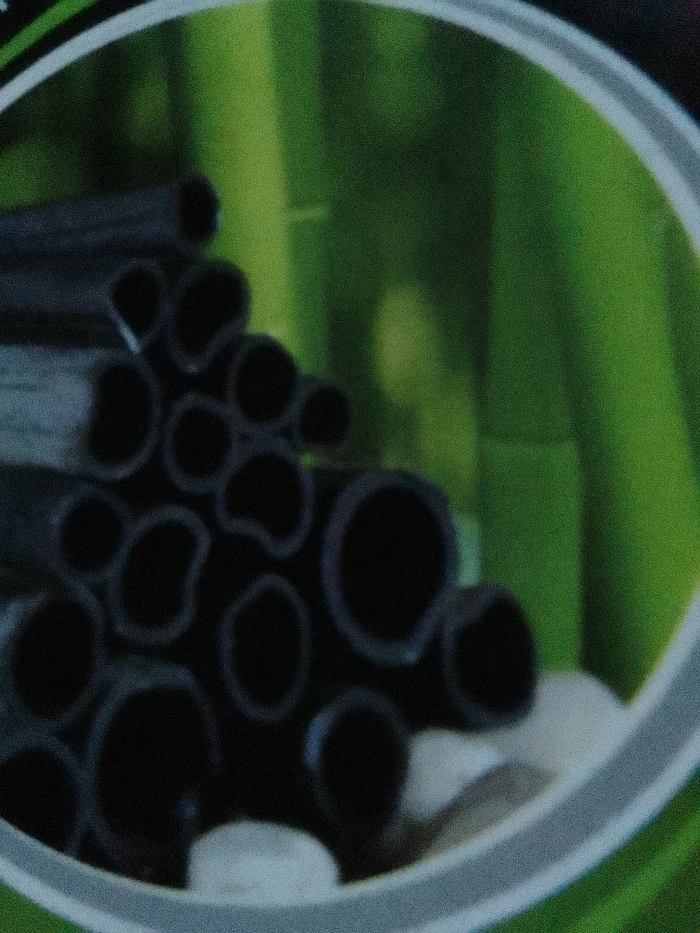 The scene, located in Oba-Aboji, Nigeria, presents a close-up view contained within a light grey circular frame. Inside this frame, a dense, irregular pile of approximately two dozen dark grey to black, hollow, cylindrical objects, consistent with bamboo charcoal sticks of varying diameters, is stacked. These objects rest on a foundation of several irregular-shaped white stones or pebbles visible at the base of the pile. The background, both within and extending beyond the circular frame, consists of blurred, vibrant green vertical elements, indicative of bamboo stalks or similar foliage, creating a naturalistic environment. No individuals, actions, or specific interactions are depicted.