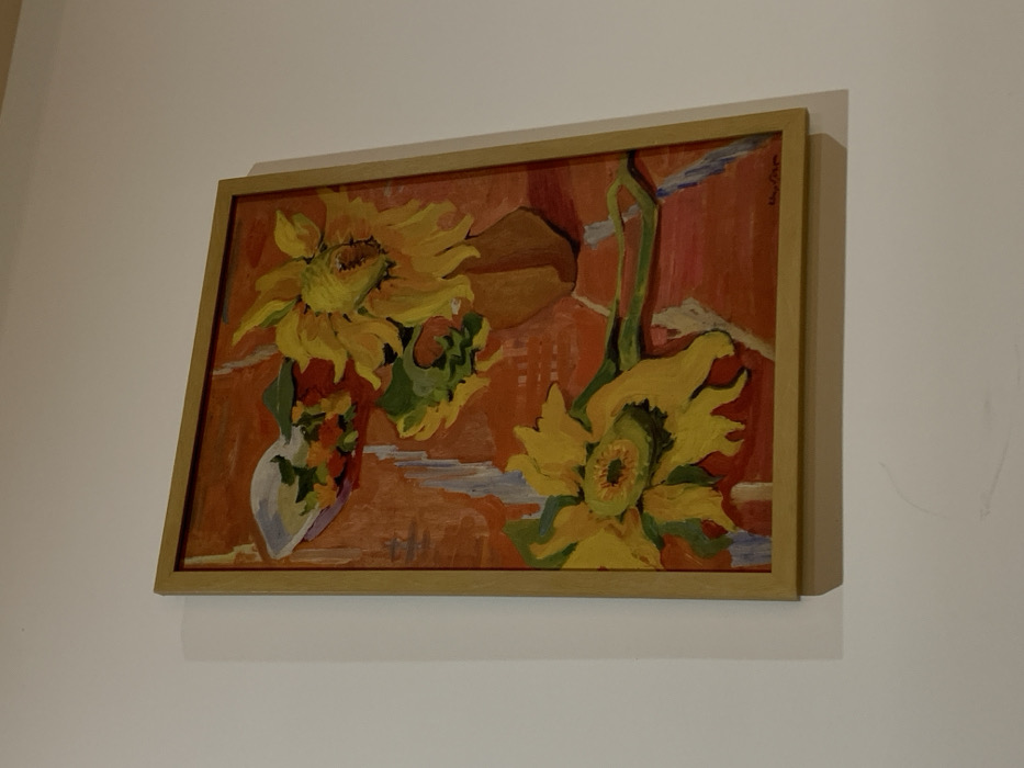 - "A framed painting featuring sunflowers in a vase, set against an abstract orange and red background" by FM-cuWTj1, licensed under CC BY 4.0