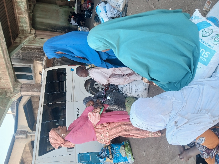 The scene depicts an outdoor gathering within a transportation or market area in Plumtree, Zimbabwe. A white passenger van, labeled "TRANSIT," is parked on a dirt ground on the left. In the foreground, two individuals are seated. One person, with her back partially to the viewer, wears a white full-length garment and head covering. To her right, another individual, also with her back to the camera, wears a teal-colored full-length garment and head covering. This individual is seated on a large white sack labeled "GOLD SUGAR 50," indicating a 50kg bag of Vitamin A Fortified sugar with a Halal logo. To the left of the frame, a woman in a pink patterned dress and matching headscarf stands, leaning towards two young children. A small child, wearing a dark head covering and patterned clothing, is seated on a black bag, looking up at the pink-clad woman. Another child, dressed in a light-colored long-sleeved garment, stands nearby, observing. Adjacent to this group, a woman in a bright blue full-length jilbab and matching head covering, which obscures most of her face except her eyes, stands observing the scene. Multiple large sacks, including bags of rice and other goods, are scattered on the ground around the individuals, suggesting items for transport or commerce. The background features a weathered concrete building with visible pillars and an upper floor containing windows. In the far right background, several indistinct figures are visible under an overhang or within a structure, indicating further activity or waiting areas.
