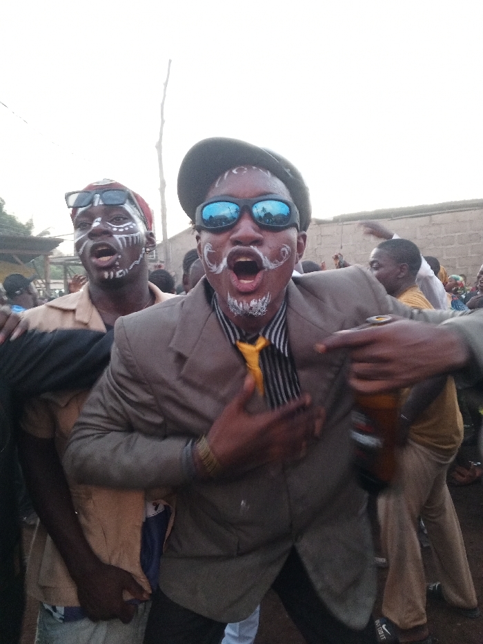 The image portrays an outdoor scene in Akwanga, Nigeria, featuring two primary dark-skinned male subjects positioned in the foreground amidst a crowd. The male on the right wears a dark cap, reflective blue sunglasses, a light brown blazer over a black-and-white striped shirt, and a yellow necktie. His face is adorned with white paint, forming patterns resembling a mustache, goatee, and lines on his forehead and cheeks. His mouth is open in an expression suggestive of shouting or singing. He holds a brown bottle in his right hand, with his index finger extended outwards, and his left hand rests on his chest. Multiple thin, light-colored bracelets are visible on his left wrist. The male on the left wears a reddish head covering with dark sunglasses positioned on top and a light brown collared shirt. His face also bears white paint, with patterns around his eyes, forehead, and chin, and his mouth is similarly open. His left arm extends around the shoulder of the male on the right. The background reveals a crowd of additional individuals, a light-colored block wall on the right, and a slender, bare tree branch or pole extending upwards in the center-left. The ground is unpaved, and the sky is overcast.