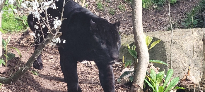 - "A black panther (Panthera pardus, melanistic form) is depicted walking from left to right through an outdoor enclosure" by FM-u2OAj2, licensed under CC BY 4.0