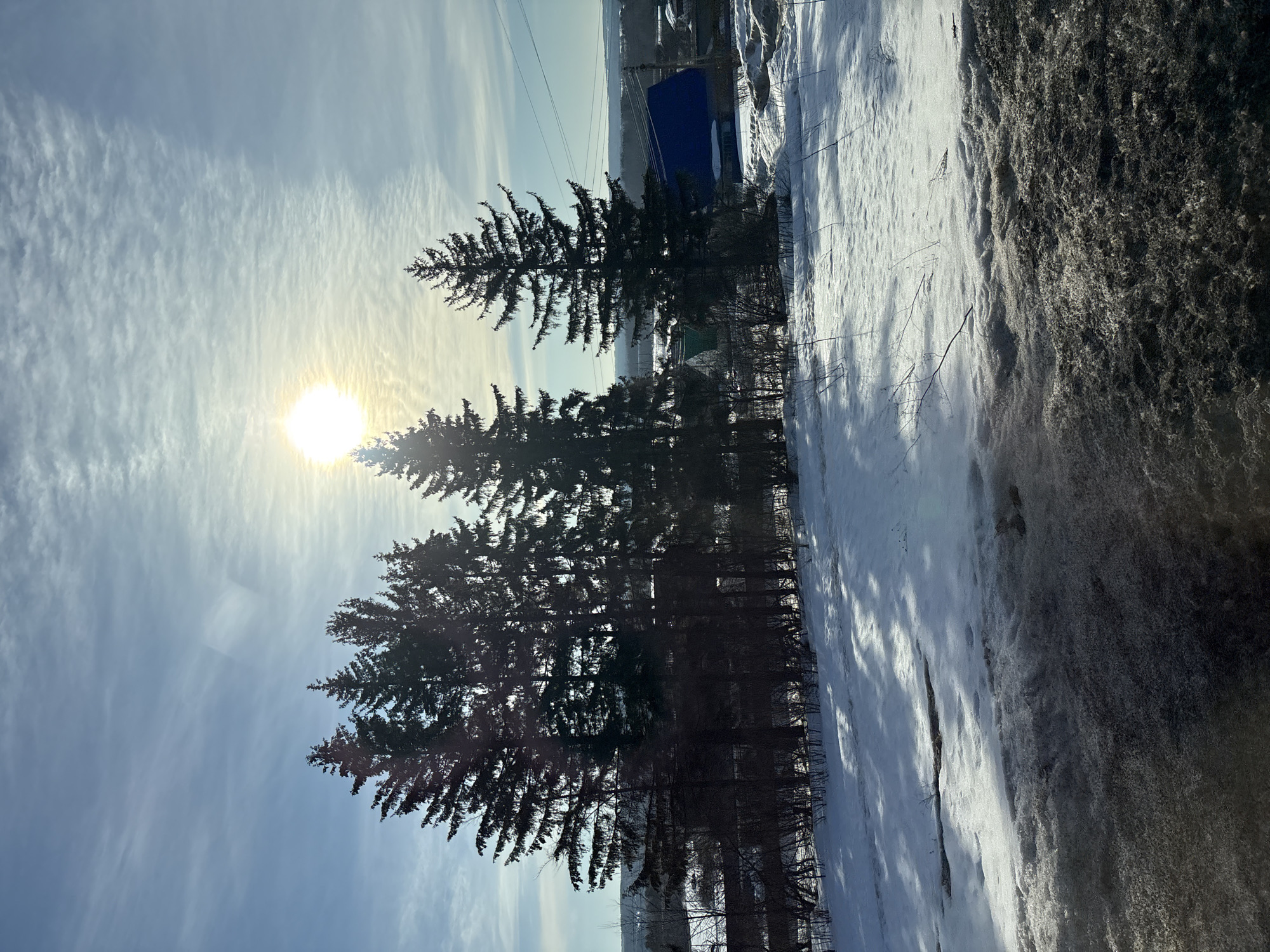The image depicts an outdoor scene in the city of Кварса, Russia, under bright daylight. The upper half of the frame presents a pale blue sky featuring scattered, wispy white clouds. A brilliant, unfiltered sun is centrally positioned in the upper right quadrant, creating a strong glare. The mid-ground is occupied by a dense cluster of approximately seven tall, dark coniferous trees, likely spruces or firs, extending from the left to the center-right and silhouetted against the bright sky. Below these prominent trees, a sparse growth of bare deciduous shrubs and smaller trees is visible. The foreground comprises snow-covered ground; the immediate bottom area shows dirty, melting snow or slush, while further back, the snow is whiter and more consistent, marked by shadows from the trees. In the background, past the tree line, several structures are discernible, including one building with a distinctive bright blue tarp or roof cover on the right side. Faint utility lines cross the sky on the far right. Distant landforms or hills are visible on the horizon. No individuals are present in the scene. The presence of snow and bare deciduous vegetation indicates a winter or early spring season.