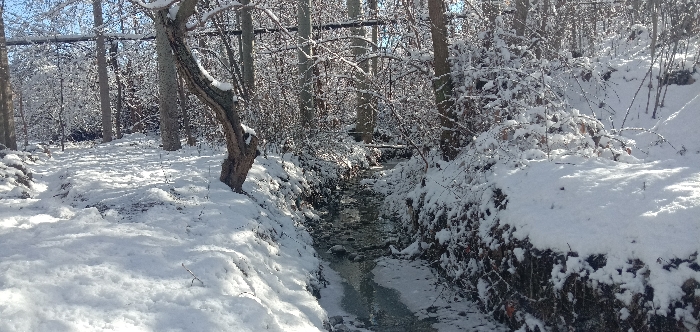 - "A narrow, snow-covered stream flows through a winter landscape" by FM-hRTV63, licensed under CC BY 4.0