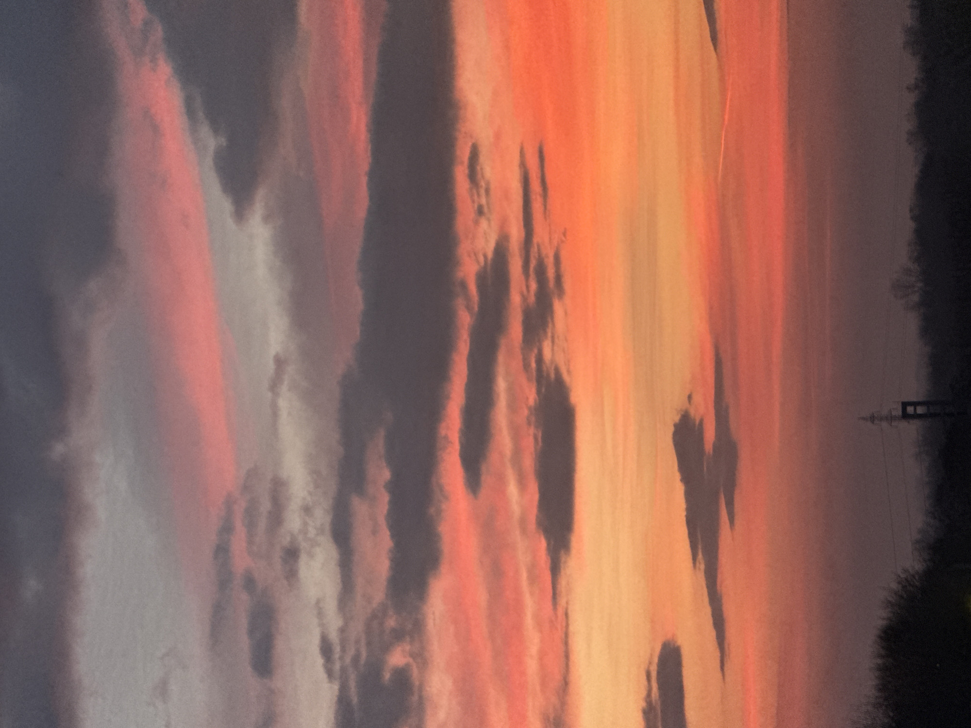 The image displays a twilight sky dominated by a vibrant gradient of colors. The upper sky features a mix of muted grey and pink hues with scattered dark grey stratiform clouds. Towards the middle and lower portions of the frame, the sky intensifies, transitioning through shades of vivid red and orange. Darker, irregular cloud formations are interspersed horizontally throughout these colorful layers. A faint, thin white linear streak, consistent with an atmospheric contrail, is visible in the mid-right section of the sky. The bottom fifth of the image presents a dark, silhouetted horizon line, composed primarily of bare tree branches and dense, dark foliage, indicative of a dormant season. Positioned against the colorful sky on the lower right, a distinct dark silhouette of a lattice-structured transmission tower or utility pole is observable. No individuals or specific activities are depicted within the frame. While the scene is attributed to Plovdiv, Bulgaria, no specific geographic landmarks or urban structures are discernible in the image to confirm a precise location within the city.