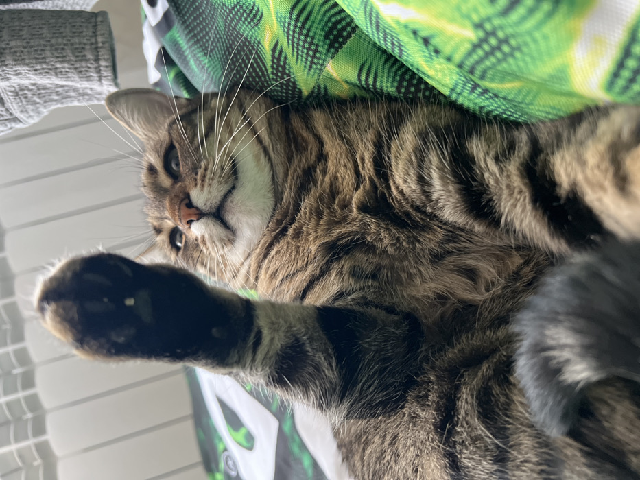 - "An indoor photograph depicts a domestic short-haired tabby cat, exhibiting brown, black, and tan striped fur, lying in a supine or reclined position" by FM-BSmMz1, licensed under CC BY 4.0