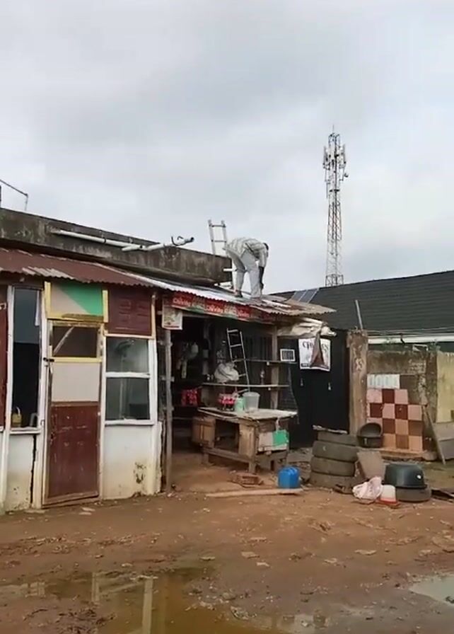A person is standing on the roof of a small, corrugated metal-roofed building next to a metal ladder. The building appears to be a shop or small business. Outside the shop is a workbench with items displayed for sale. The ground is muddy with puddles of water. In the background, a tall cell tower rises above the scene. The sky is overcast. There are tires and some scattered materials near the shop. Another building with a dark gray roof is partially visible behind the shop.