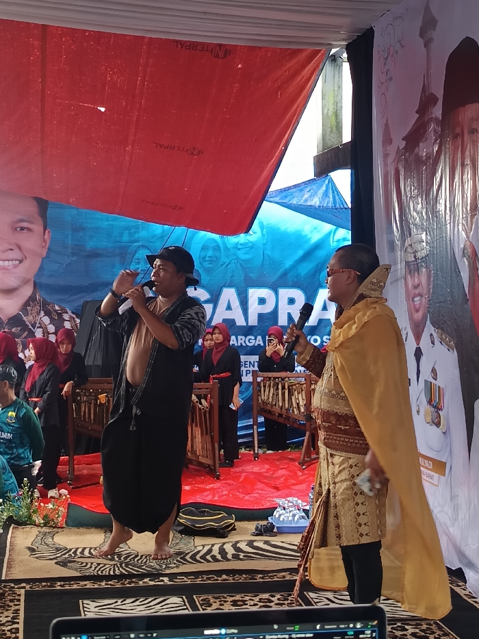The scene depicts an outdoor event in Kawungluwuk, Indonesia, under a temporary canopy constructed from red and blue tarpaulins. Two men are central on a stage area covered with a zebra-patterned rug over a red tarp. The man on the left, barefoot, wears a dark bucket hat, an open patterned dark vest over a light garment, and dark loose pants, holding a microphone to his mouth while gesturing with his left hand. The man on the right, wearing sunglasses, is dressed in a gold and brown patterned traditional tunic, black pants, and a flowing gold cape, also holding a microphone to his mouth. Behind them, several women in dark attire and red headscarves stand next to wooden racks that appear to be angklung instruments; one woman holds a smartphone, seemingly recording. Large banners in the background feature portraits of individuals, including a man in a batik shirt on the left and a man in a white uniform adorned with medals on the right, with partial text "GAPRA" and "MULYADI" visible. A black bag and small white containers rest on the red tarp near the right man's feet. A laptop screen is partially visible in the bottom foreground.