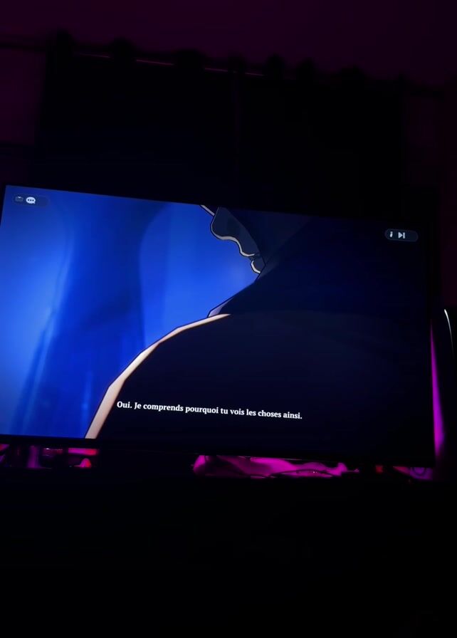 A television screen displays a close-up image of a dark-haired character with fair skin and shadowed facial features. The character is set against a blue and white backdrop. A subtitle in French reads, "Oui. Je comprends pourquoi tu vois les choses ainsi. Mais j'aurais pris la même décision, quelle que soit la ligne temporelle." The screen is in a dark room with a black curtain in the background and a pink light illuminating the bottom edge of the screen.