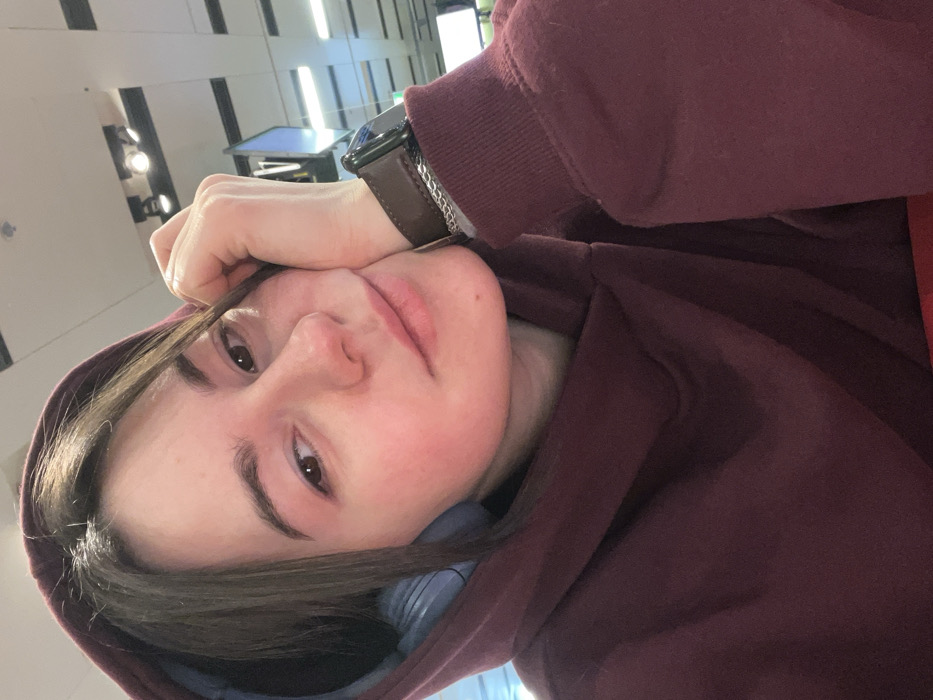 A close-up portrait features a young adult female, approximately 20-30 years old, in an indoor public setting identified as Vienna International Airport in Schwechat, Austria. She has dark brown hair, with some strands framing her face, and a fair complexion exhibiting a flushed appearance on her cheeks and nose. Her dark eyes maintain direct contact with the viewer, and her lips form a subtle, closed smile. She is wearing a maroon-colored hooded sweatshirt with the hood drawn up, partially covering her hair. Light blue over-ear headphones are visible beneath the hood, resting around her ears or neck. Her left hand props up the left side of her face, with fingers gently curled and her thumb supporting her jawline. On her right wrist, a smartwatch with a dark brown band is present, accompanied by a thin, silver-colored chain bracelet. The background is softly out of focus, revealing a modern interior with white ceilings, recessed spotlights, and linear fluorescent lighting fixtures. A dark vertical structure featuring a partial lighter "V" shape and a faint green element are discernible in the upper right background, consistent with architectural and signage elements found in an airport terminal.