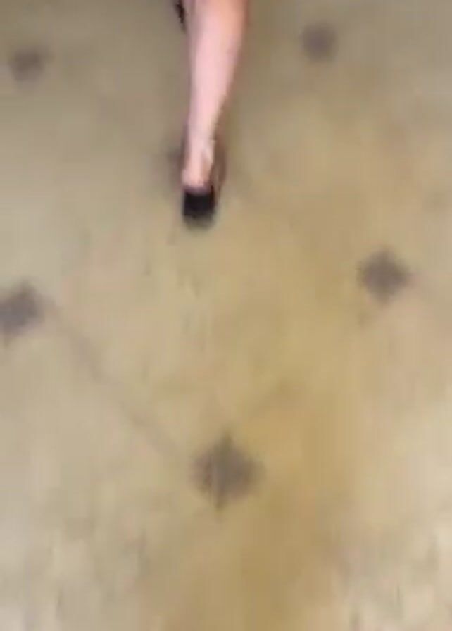 A person wearing patterned pants and sandals walks across a tile floor