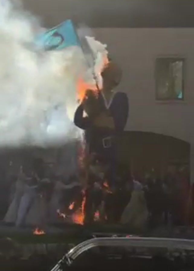 person standing on what appears to be a pier, surrounded by flames. The person is wearing a dark blue outfit with a white collar and a belt. They hold a light blue flag in their left hand, which is slightly raised. Smoke billows around them, partially obscuring their face and the background. The fire appears to be concentrated around their lower body and the pier itself. In the foreground, a metal railing of a boat is visible, suggesting the video is taken from the water. There are other people blurred in the background.
