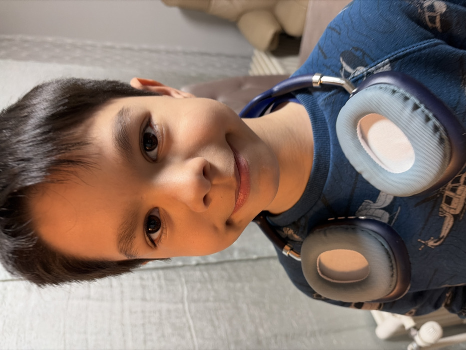 A young male individual, appearing to be between 6 and 10 years of age, is depicted in a chest-up portrait. He possesses dark hair, dark eyes, and a light complexion, exhibiting a subtle, closed-mouth smile while looking directly forward. The individual wears a dark blue long-sleeved sweatshirt patterned with light-colored aircraft or helicopter motifs. Around his neck, a pair of dark blue over-ear headphones with light blue-grey earcups and silver metallic components is suspended. The earcups feature prominent white inner padding. The background to the subject's left is a light-colored, textured wall. To the right, the background is blurred, revealing warm tones consistent with upholstered furniture, likely a beige chair or sofa, and possibly another wall with faint vertical patterns. The specific geographical location, including any city such as Ghent, Belgium, is not discernible from the visual evidence presented in the image.