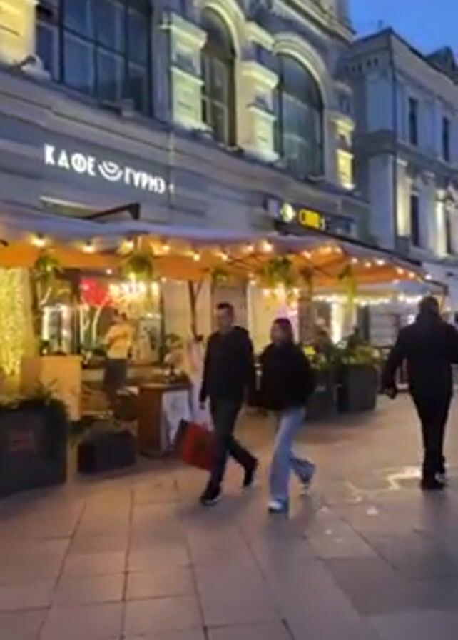 n outdoor cafe or restaurant area with a lit awning and decorations at dusk. The building facade is decorated with arched windows and architectural details. Pedestrians are walking on the stone-tiled sidewalk. Cafe signage reads "Кафе Гурмэ" (Cafe Gourmet) in Russian. There are tables and chairs set up under the awning, with additional planters and decorations. The sky is a pale blue, indicating early evening.